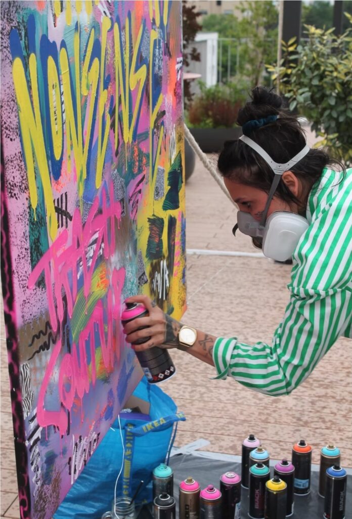 My practice blends quality spray paint (Montana gold/ black),chains and acrylic paint (posca) with refined mixed media layers.